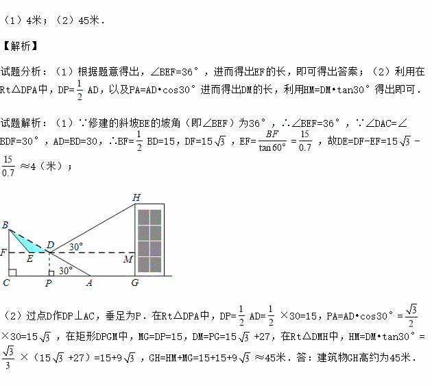 (1)若修建的斜坡BE 的坡角为36°,则平台DE的长约为多少米?