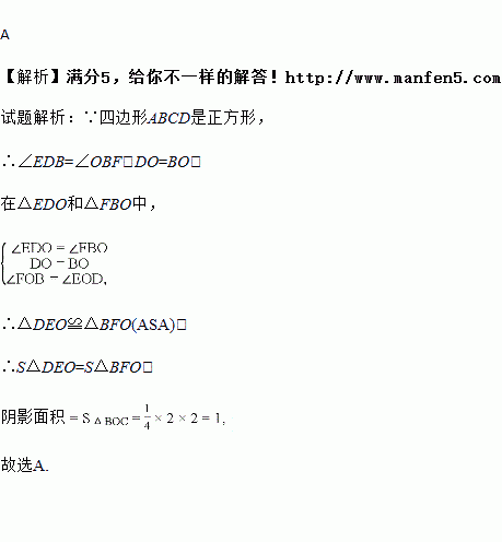 如图,边长为2的正方形ABCD的对角线相交于点O,过点O的直线分别交边AD、BC于E、F两点,则阴影部分的面积是( )