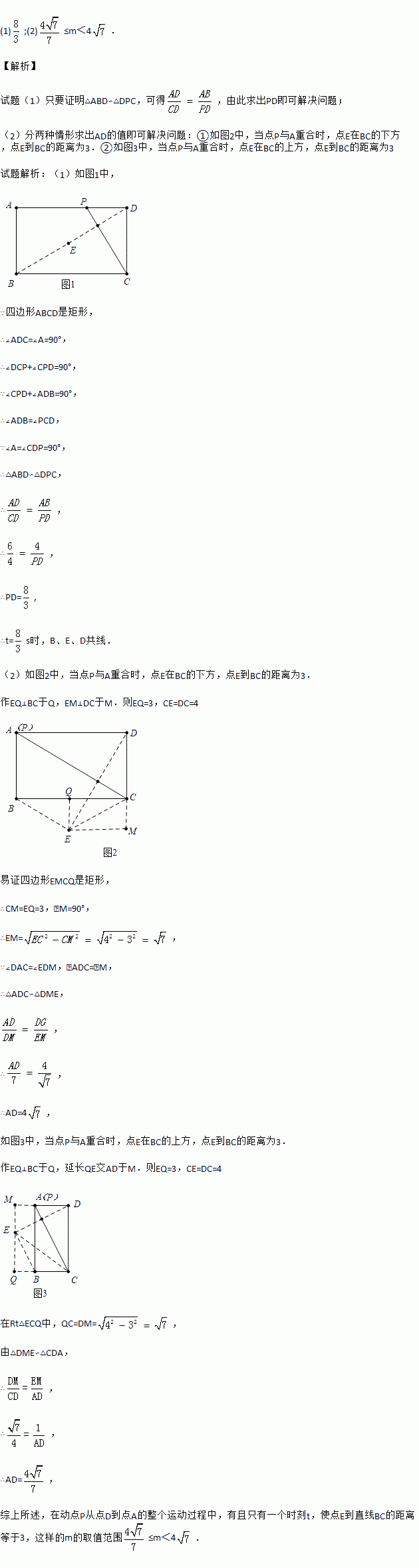 (2)已知m满足:在动点P从点D到点A的整个运动过程中,有且只有一个时刻t,使点E到直线BC的距离等于3,求所有这样的m的取值范围.![]()