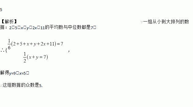 (2017·江西)已知一组从小到大排列的数据:2,5,x,y,2x,11的平均数与中位数都是7,则这组数据的众数是_______.