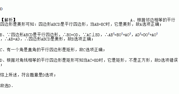 C. 当∠ABC=90°时,它是矩形 D. 当AC=BD时,它是正方形