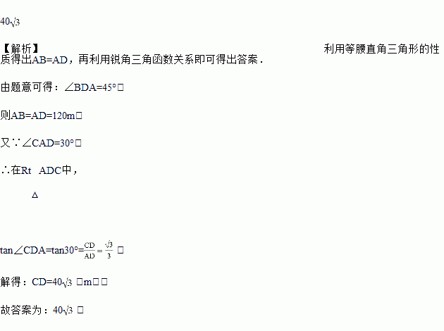 如图,从甲楼底部A处测得乙楼顶部C处的仰角是30°,从甲楼顶部B处测得乙楼底部D处的俯角是45°,已知甲楼的高AB是120m,则乙楼的高CD是_____m(结果保留根号)