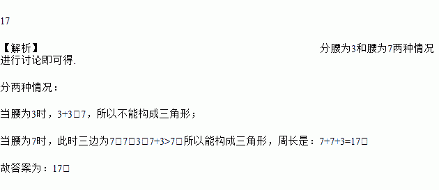 等腰三角形的两边长是3和7,则这个三角形的周长等于_____.