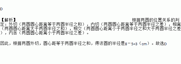 已知⊙O1与⊙O2外切,O1O2=8cm,⊙O1的半径为5cm,则⊙O2的半径是( )
