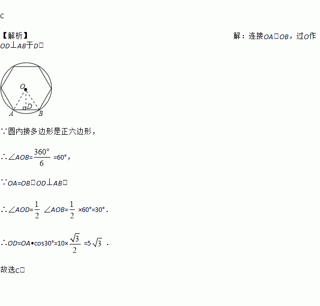从一个半径为10的圆形纸片上裁出一个最大的正六边形,此正六边形的边心距是( )