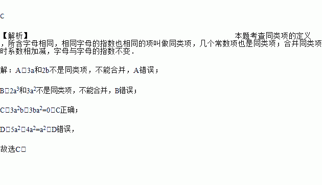 C 【解析】本题考查同类项的定义,所含字母相同,相同字母的指数也相同的项叫做同类项,几个常数项也是同类项;合并同类项时系数相加减,字母与字母的指数不变. 【解析】 A、3a和2b不是同类项,不能合并,A错误; B、2a3和3a2不是同类项,不能合并,B错误; C、3a2b﹣3ba2=0,C正确; D、5a2﹣4a2=a2,D错误, 故选C.