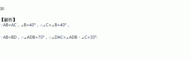 如图,在△ABC中,AB=AC,∠B=40°,以B为圆心,BA的长为半径画弧,交BC于点D,连接AD,则∠DAC的度数是_______°.