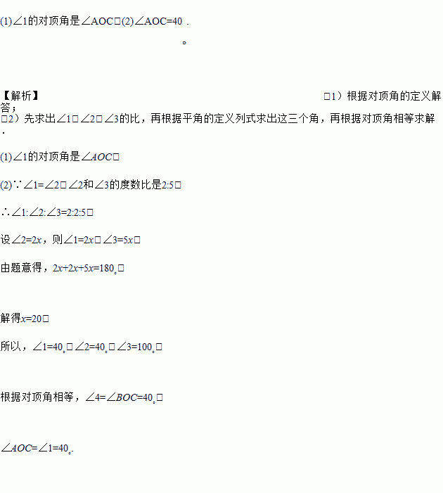 如图,直线AB,CD相交于点O,且∠1=∠2.(1)指出∠1的对顶角;(2)若∠2和∠3的度数比是2:5,求∠4和∠AOC的度数.