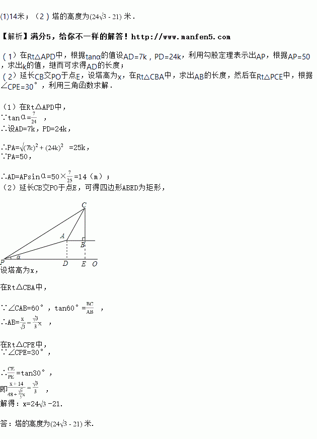 如图,在一斜坡坡顶处的同一水平线上有一古塔,为测量塔高![]()