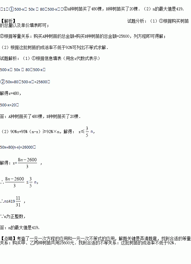 ½ñÄêÎÒУΪÂÌ»¯Ð£Ô°£¬¼Æ»®¹ºÂòA¡¢BÁ½ÖÖÊ÷Ãç¹²n¿Ã£¬É蹺ÂòAÖÖÊ÷Ãçx¿Ã£¬ÓйØA¡¢BÁ½ÖÖÊ÷ÃçµÄÐÅÏ¢ÈçÏ£º AÖÖÊ÷Ãçÿ¿Ã50Ôª£¬BÖÖÊ÷Ãçÿ¿Ã80Ôª£»AÖÖÊ÷ÃçµÄ³É»îÂÊΪ90©‡£¬BÖÖÊ÷ÃçµÄ³É»îÂÊΪ95©‡.
