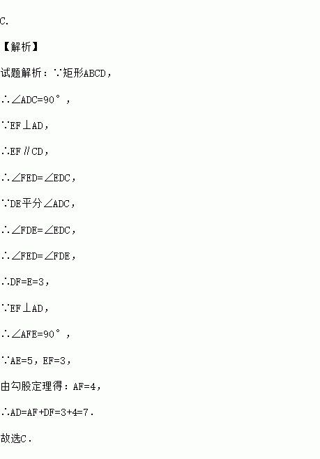 如图,在矩形ABCD中,DE平分∠ADC交BC于点E,EF⊥AD交AD于点F,若EF=3,AE=5,则AD等于( )