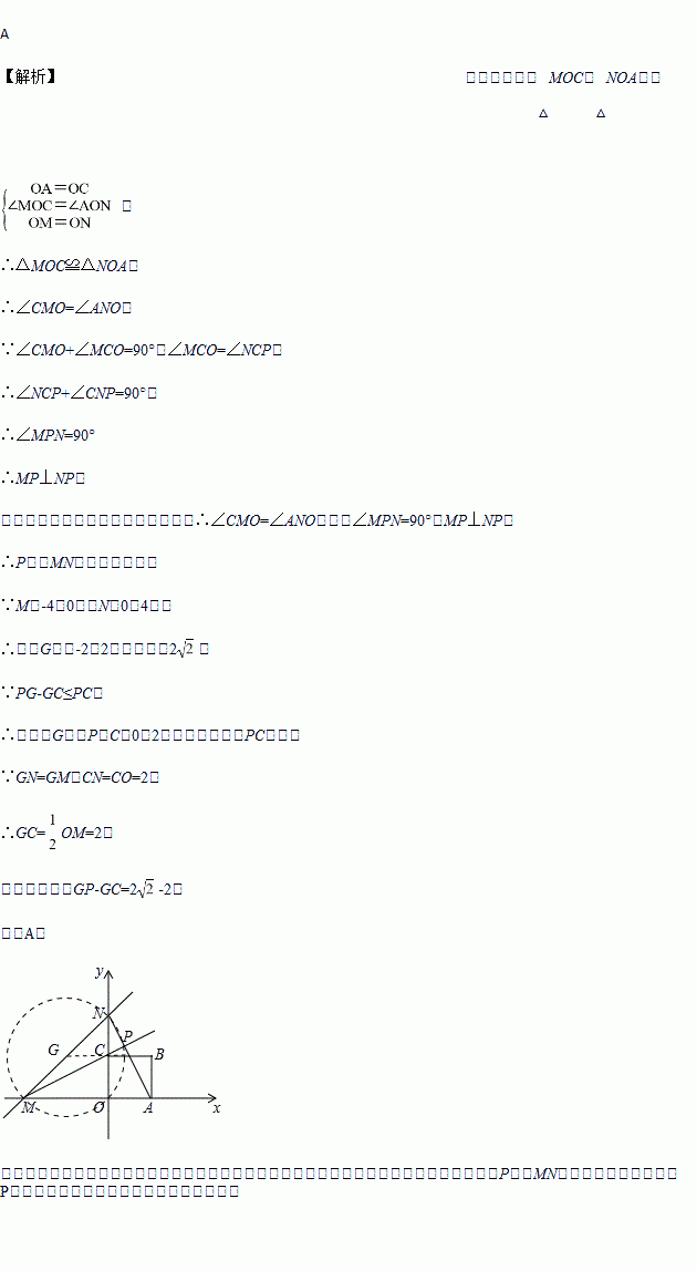 分别与x轴、y轴相交与点M、N,边长为2的正方形OABC一个顶点O在坐标系的原点,直线AN与MC相交与点P,若正方形绕着点O旋转一周,则点P到点(0,2)长度的最小值是( )