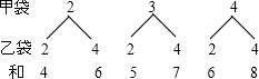 7.将5个完全相同的小球装甲、乙两个不透明的口袋中,甲袋装3个,乙袋装2个,甲袋球标有数字2、3、4,乙袋标2、4,从两袋中各摸一球.(1)用列表法或树状法,求模出的数字之和为5的概率.