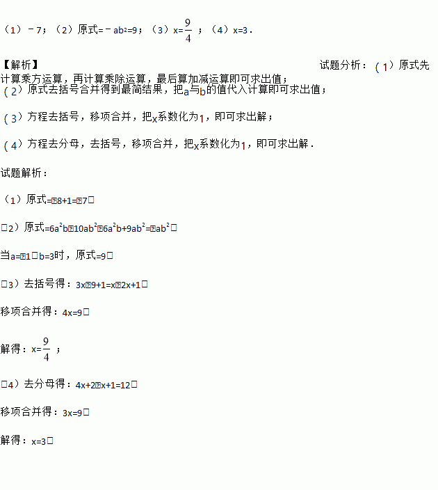 (1)计算 (﹣1)2×(﹣23)﹣(﹣4)÷2×![]()