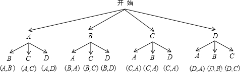 Ë®¹ûÖÖÖ²´ó»§Ð¡·½£¬ÎªÁËÎüÒý¸ü¶àµÄ¹Ë¿Í£¬×éÖ¯Á˹۹â²ÉÕªÓλ£®Ã¿Ò»Î»À´²Éժˮ¹ûµÄ¹Ë¿Í¶¼ÓÐÒ»´Î³é½±»ú»á£ºÔÚÒ»Ö»²»Í¸Ã÷µÄºÐ×ÓÀïÓÐA£¬B£¬C£¬DËÄÕÅÍâÐÎÍêÈ«ÏàͬµÄ¿¨Æ¬£¬³é½±Ê±ÏÈËæ»ú³é³öÒ»ÕÅ¿¨Æ¬£¬ÔÙ´ÓºÐ×ÓÖÐʣϵÄ3ÕÅÖÐËæ»ú³éÈ¡µÚ¶þÕÅ£®£¨1£©ÇëÀûÓÃÊ÷״ͼ£¨»òÁÐ±í£©µÄ·½·¨£¬±íʾǰºóÁ½´Î³éµÃµÄ¿¨Æ¬ËùÓпÉÄܵÄÇé¿ö£»
