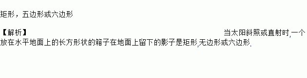 矩形,五边形或六边形 【解析】当太阳斜照或直射时,一个放在水平地面上的长方形状的箱子在地面上留下的影子是矩形,无边形或六边形.