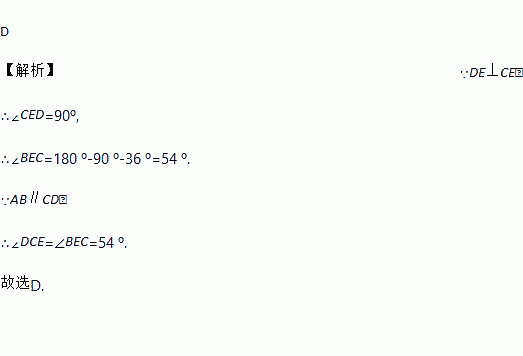 如图,AB∥CD,DE⊥CE,∠1=36°,则∠DCE的度数为( )