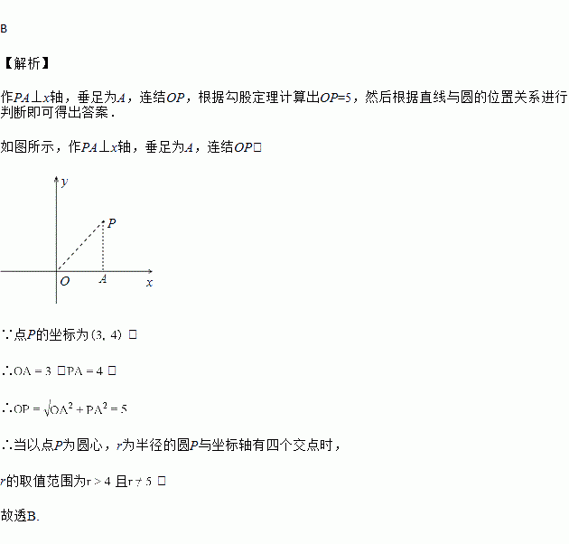 已知点P(3,4),以点P为圆心,r为半径的圆P与坐标轴有四个交点,则r的取值范围是( )