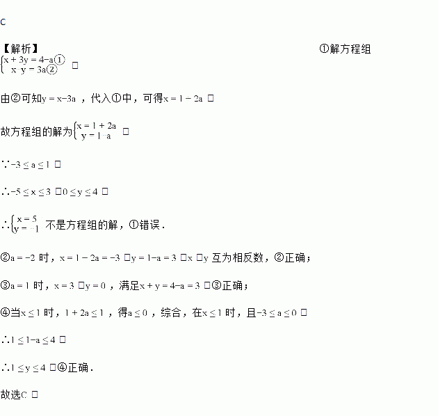 C 【解析】①解方程组, 由②可知,代入①中,可得, 故方程组的解为, ∵, ∴,, ∴不是方程组的解,①错误. ②时,,,,互为相反数,②正确; ③时,,,满足,③正确; ④当时,,得,综合,在时,且. ∴, ∴,④正确. 故选.