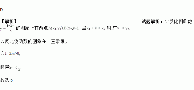 已知反比例函数的图象上两点A(x1,y1),B(x2,y2),当x1<0<x2时,有y1<y2,则m的取值范围是 ( )
