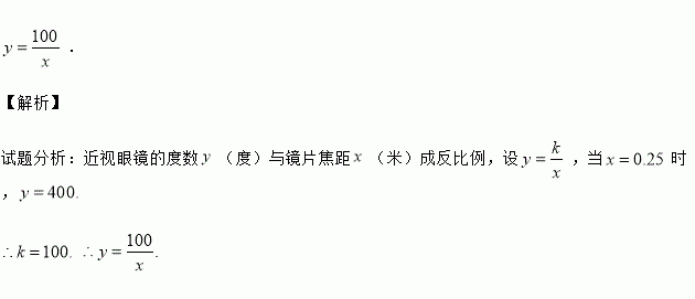 近视眼镜的度数(度)与镜片焦距(米)成反比例,已知400度近视眼镜镜片的焦距为0.25米,则眼镜度数与镜片焦距之间的函数关系式为 .