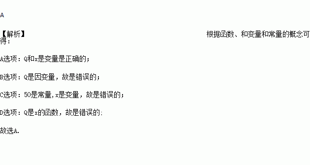 A. Q和x是变量 B. Q是自变量 C. 50和x是常量 D. x是Q的函数