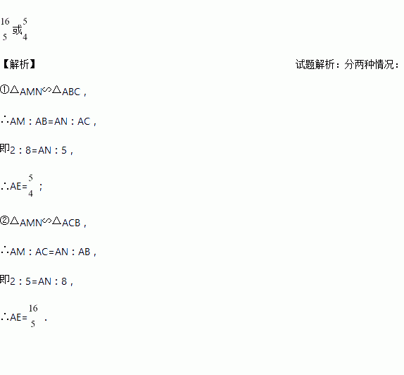如图5, 在△ABC中,AB=8,AC=5,M是AC边上的一点,AM=2, 在AB边上取一点N,使以A、M、N为顶点的三角形与△ABC相似,则AN的长为__________.