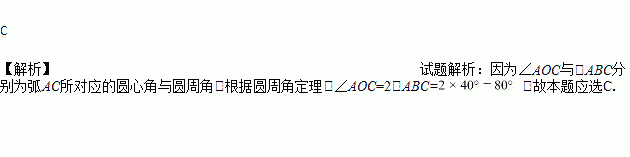 如图,在⊙O中,点B是圆上一点,且∠ABC=40°,则∠AOC=( )