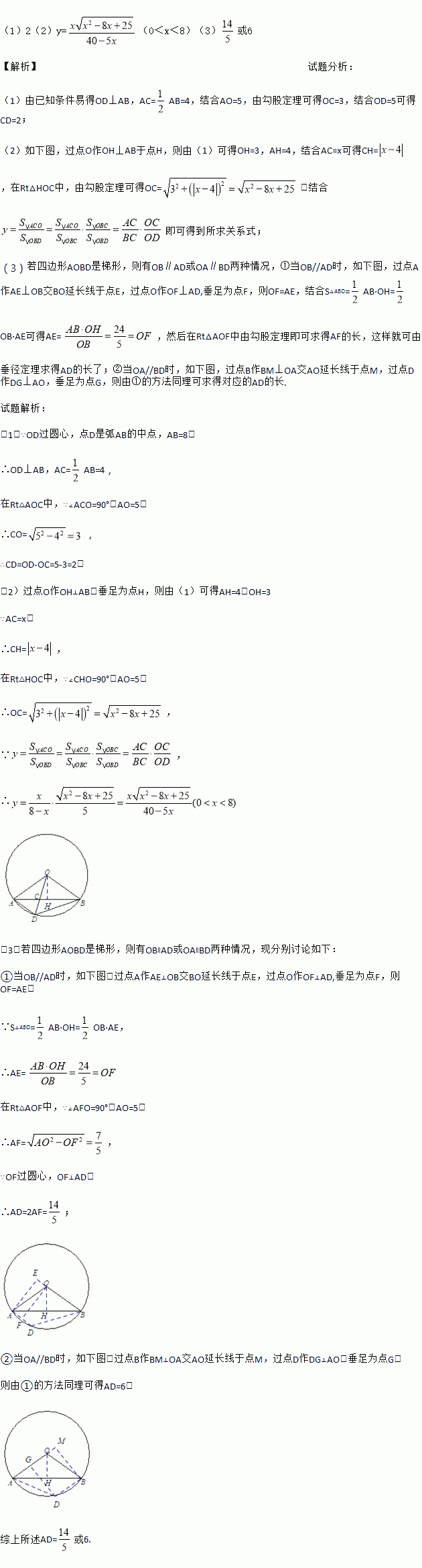 在圆O中,C是弦AB上的一点,联结OC并延长,交劣弧AB于点D,联结AO、BO、AD、BD. 已知圆O的半径长为5 ,弦AB的长为8.