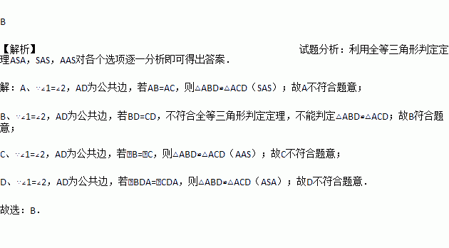 已知:如图,∠1=∠2,则不一定能使△ABD≌△ACD的条件是 ( )