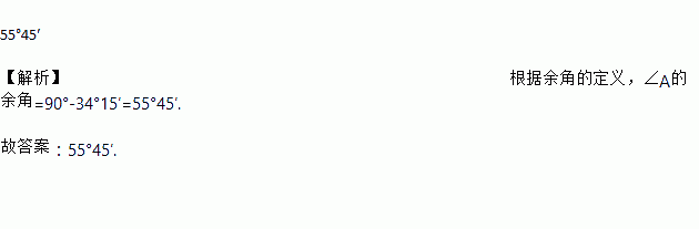如果∠A=34°15′,那么∠A的余角等于________ .