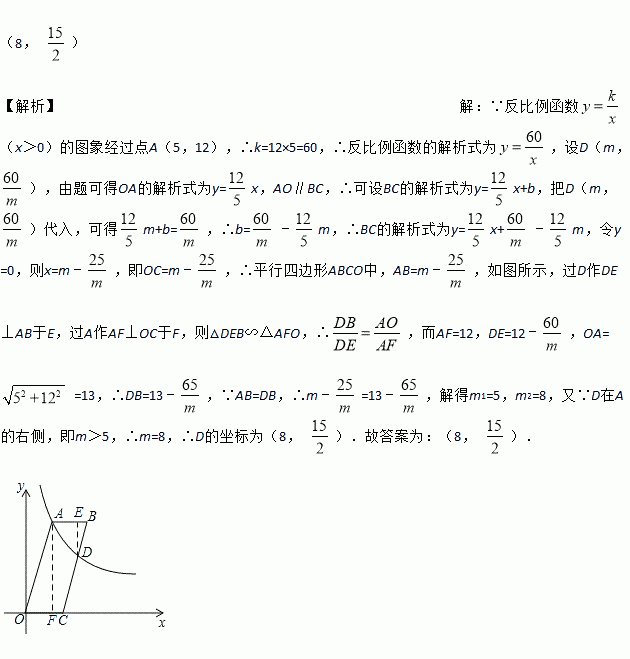 如图,四边形OABC是平行四边形,点C在x轴上,反比例函数y=(x>0)的图象经过点A(5,12),且与边BC交于点D.若AB=BD,则点D的坐标为_____.
