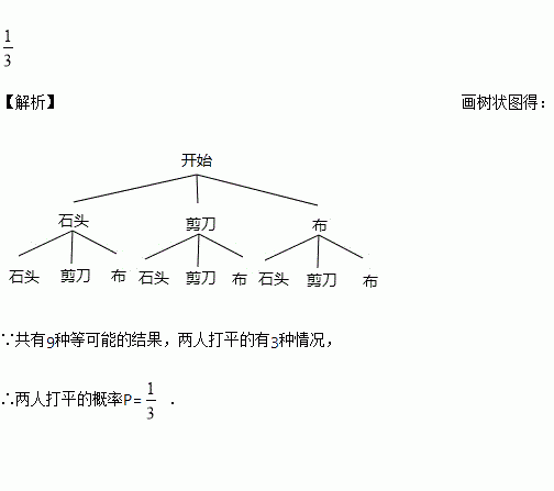 如图,“石头、剪刀、布”是民间广为流传的游戏.据报道,“国际剪刀石头布协会”提议将“剪刀石头布”作为奥运会比赛项目.“剪刀石头布”比赛时双方每次任意出“剪刀”、“石头”、“布”这三种手势中的一种,规则为:剪刀胜布,布胜石头,石头胜剪刀,若双方出现相同手势,则算打平.若小刚和小明两人只比赛一局,那么两人打平的概率P=________.