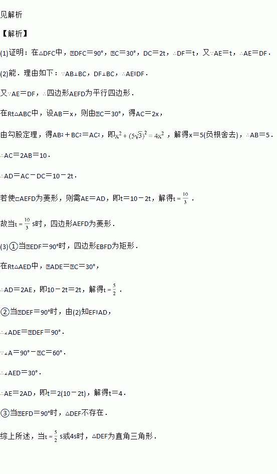 ,∠C=30°.点D从点C出发沿CA方向以每秒2个单位长的速度向点A匀速运动,同时点E从点A出发沿AB方向以每秒1个单位长的速度向点B匀速运动,当其中一个点到达终点时,另一个点也随之停止运动.设点D、E运动的时间是t秒(t>0).过点D作DF⊥BC于点F,连接DE、EF.