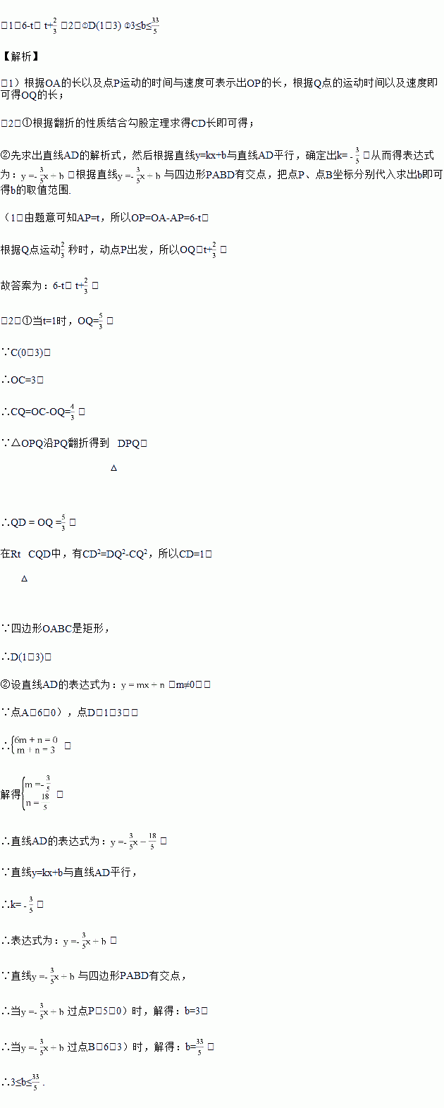 (2)当时,将△OPQ沿PQ翻折,点O恰好落在CB边上的点D处.![]()