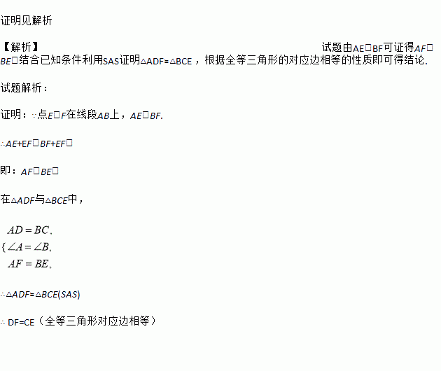 如图,点E,F在线段AB上,且AD=BC,∠A=∠B,AE=BF.求证:DF=CE.