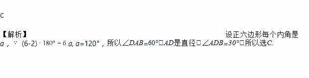 如图所示,正六边形ABCDEF内接于⊙O,则∠ADB的度数是().