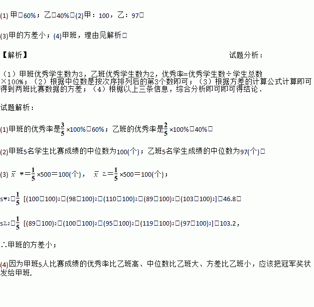 某校九年级学生开展踢毽子比赛活动,每班派5名同学参加,按团体总分多少排列名次,在规定时间内每人踢100个以上(含100)为优秀,下表是成绩最好的甲班和乙班5名学生的比赛数据(单位:个):
