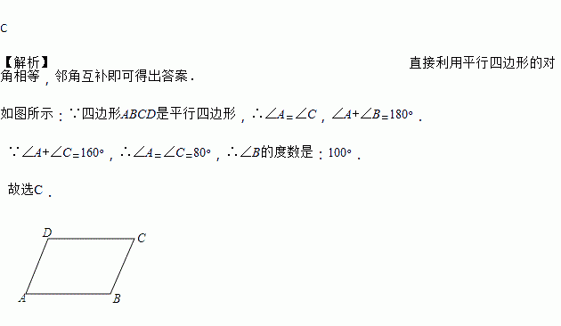 在平行四边形ABCD中,∠A+∠C=160°,则∠B的度数是( )