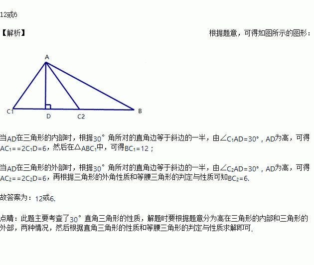 已知△ABC中,∠B=30°, AD为高, ∠CAD=30°, CD=3, 则BC=_________