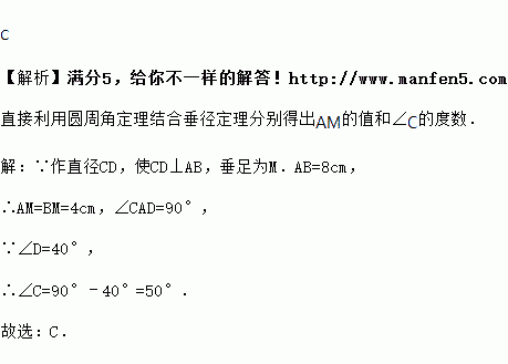 如图,AB是⊙O的一条弦,作直径CD,使CD⊥AB,垂足为M.AB=8cm,∠D=40°,那么AM的值和∠C的度数分别是( )