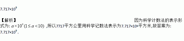 7.717×109 【解析】因为科学计数法的表示形式为: ,所以7717平方公里用科学记数法表示为7.717×109平方米,故答案为: 7.717×109 .