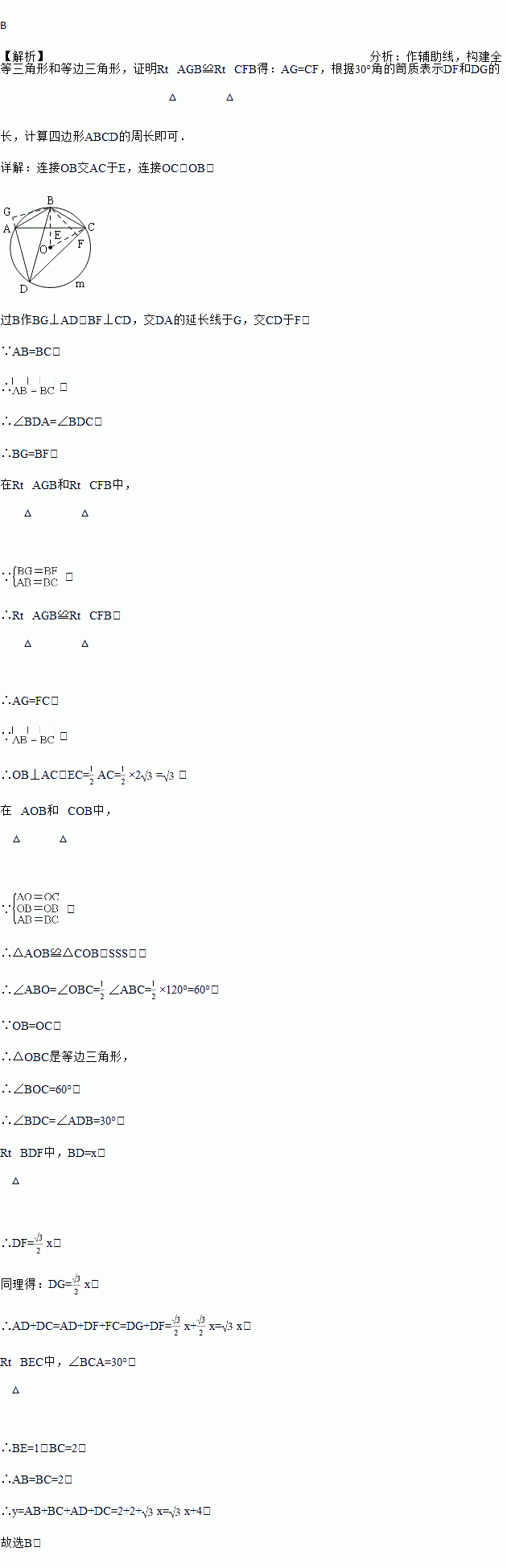 ,⊙O是△ABC的外接圆,D是优弧AmC上任意一点(不包括A,C),记四边形ABCD的周长为y,BD的长为x,则y关于x的函数关系式是( )