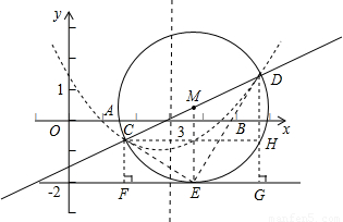 已知二次函数图象经过两点A(1,0)、B(5,0),且函数有最小值-1.直线y=m(x-3)与二次函数图象交于C、D两点.(1)求二次函数的解析式;