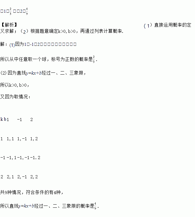 (2) 搅匀后,从中任取一个球,标号记为k,然后放回搅匀再取一个球,标号记为b,求直线y=kx+b经过一、二、三象限的概率.