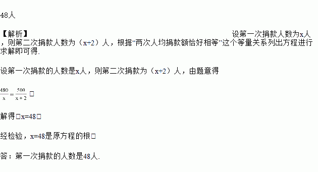 为了帮助遭受自然灾害的地区重建家园,龙岗区某学校团总支号召同学们自愿捐款,已知第一次捐款总额为480元,第二次捐款总额为500元,第二次捐款人数比第一次多2人,而且两次人均捐款额恰好相等.求第一次捐款的人数.