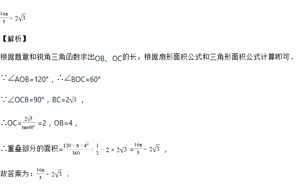 如图,将一块实心三角板和实心半圆形量角器按图中方式叠放,三角板一直角边与量角器的零刻度线所在直线重合,斜边与半圆相切,重叠部分的量角器弧对应的圆心角(∠AOB)为120°,BC的长为2