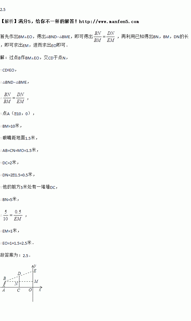 如图,直角坐标平面内,小明站在点A(﹣10,0)处观察y轴,眼睛距地面1.5米,他的前方5米处有一堵墙DC,若墙高DC=2米,则小明在y轴上的盲区(即OE的长度)为_____米.