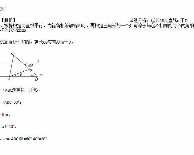 如图,l∥m,等边△ABC的顶点A在直线m上,则∠=_________.