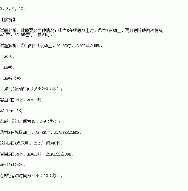 如图,CA⊥AB,垂足为点A,AB=12,AC=6,射线BM⊥AB,垂足为点B,一动点E从A点出发以2厘米/秒沿射线AN运动,点D为射线BM上一动点,随着E点运动而运动,且始终保持ED=CB,当点E经过 秒时,△DEB与△BCA全等.
